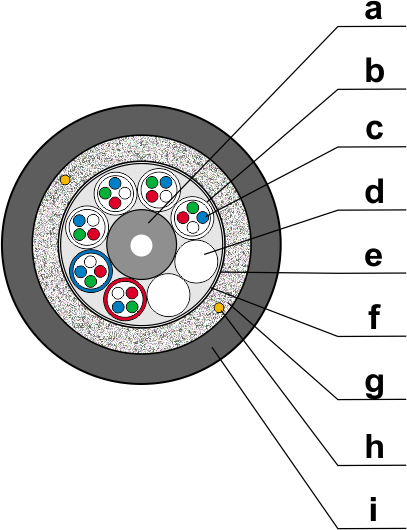 ![]() | Budowa kabla Z-XOTKtsd b: tuba luźna tuba ze światłowodami wypełniona żelem hydrofobowym c: włókno optyczne jenomodowe (J) , jednomodowe z przesuniętą dyspersją (Jn), wielomodowe (G/50), wielomodowe (G/62,5) d: wkładka wkładka wypełniająca z polietylenu e: ośrodek kabla ośrodek stanowią wszystkie tuby i wkładki skręcone wokół centralnego elementu wytrzymałościowego ; ośrodek składa się z 6,8,12,18 lub 24 elementów f: uszczelnienie ośrodka suche g: wzmocnienie włókna szklane oplatające ośrodek kabla h: ripcord 2 nitki do rozcinania kabla i: powłoka powłoka zewnętrzna czarna HDPE |