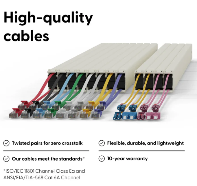 Krótsze przestojeKorzystanie z PATCHBOX może się opłacić już po jednym przestoju | Do 50% więcej miejscaW porównaniu z konwencjonalnym okablowaniem do 50% więcej miejsca w szafie | 10-letnia gwarancjaSpokój ducha gwarantowany przez co najmniej 10 lat | Do 10x szybciejKonserwacja i instalacja są nawet dziesięciokrotnie szybsze |