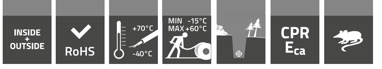 Zewnętrzna powłoka z tworzywa bezhalogenowego FRLSOH nie rozprzestrzenia płomienia i gwarantuje bezpieczeństwo użytkowania w pomieszczeniach. Dodatkowa powłoka poliamidowa (NV) stanowi skuteczną ochronę przed gryzoniami, co umożliwia instalację kabla zarówno w budynkach, jak i w warunkach terenowych.